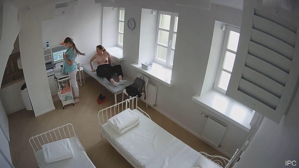 Voyeur watches the pregnant girl lying topless on the exam bed with her round belly fully exposed during the ECG. Her firm breasts with dark nipples stand out prominently as the nurse presses sticky cold electrodes straight onto the soft skin. Chills race through her heavy tits making the nipples stiffen instantly from the sudden contact. She feels deep embarrassment mixed with unexpected tingles as the wires tug lightly on her bare chest. Every heartbeat sends subtle vibrations through her exposed breasts while the machine monitors her.