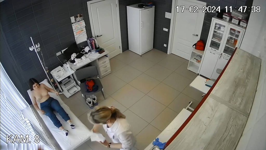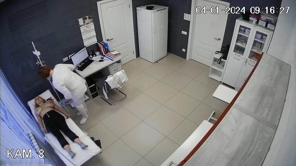 The young girl lay topless on the examination couch wearing only a tiny pair of panties. Her large beautiful breasts were fully exposed, spreading slightly to the sides as she lay on her back. The nurse attached ECG electrodes, pressing them firmly onto her smooth skin. Her perky nipples stood hard from the cool touch of the sensors on her naked chest. She breathed quietly while her big breasts rose and fell with every breath during the procedure. Her bare chest and big tits remained completely uncovered as the ECG recording continued.