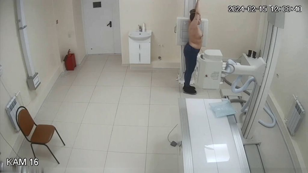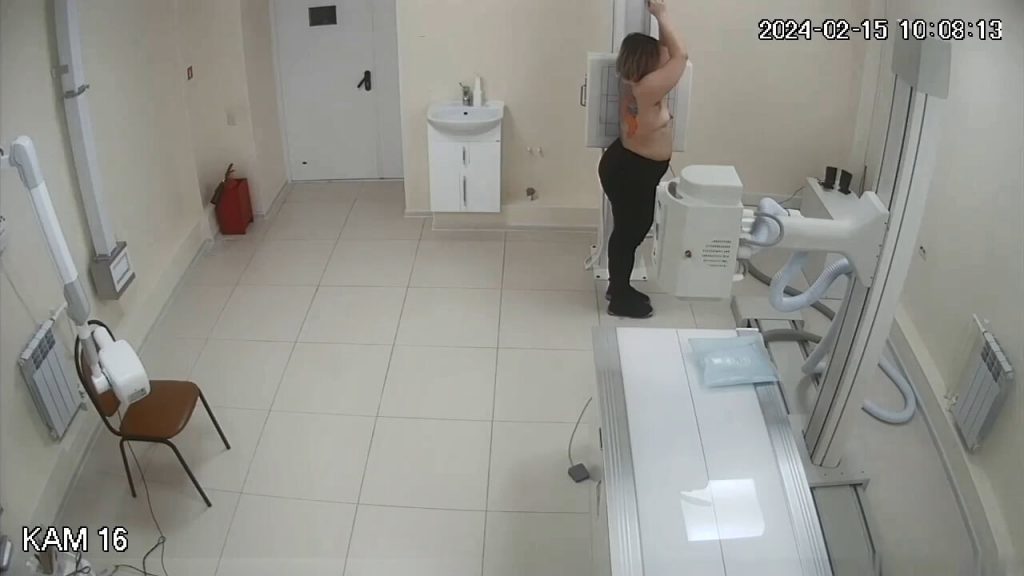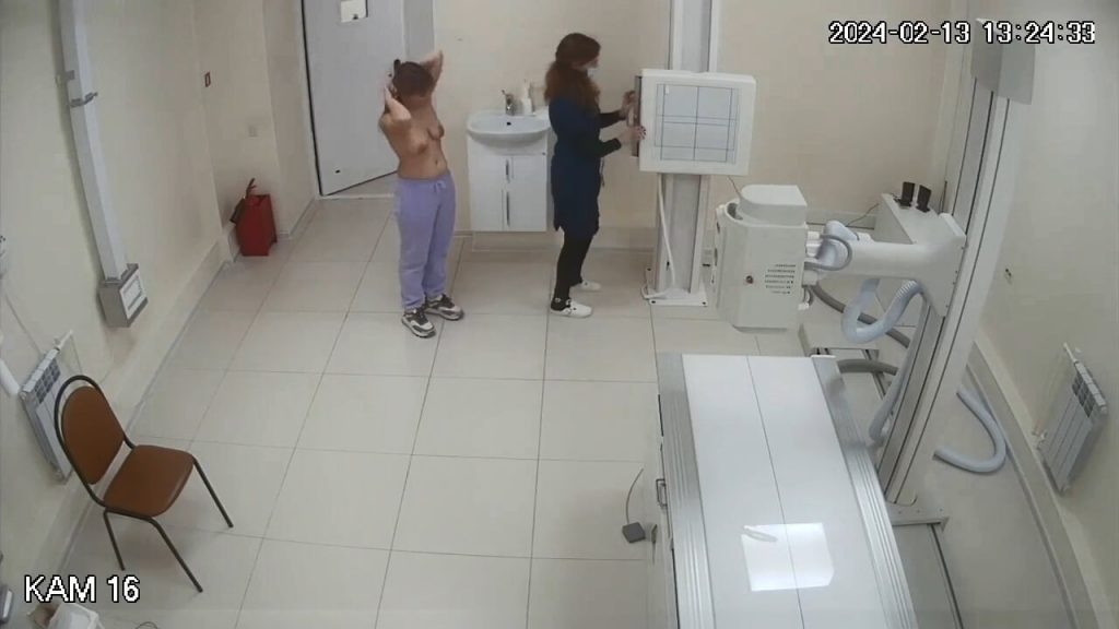 Hidden camera captured the topless girl standing in front of the fluorography machine. Her firm bare breasts pressed tightly against the cold plate as she raised both arms high above her head. She turned slightly to the side, making her tits flatten and shift against the hard surface. The doctor instructed her to take a deep breath while she arched her back, pushing her naked chest forward. Her stiff nipples brushed the cold metal with every small adjustment of her posture. She obediently changed positions, fully exposing her bare tits to the X-ray machine from different angles.