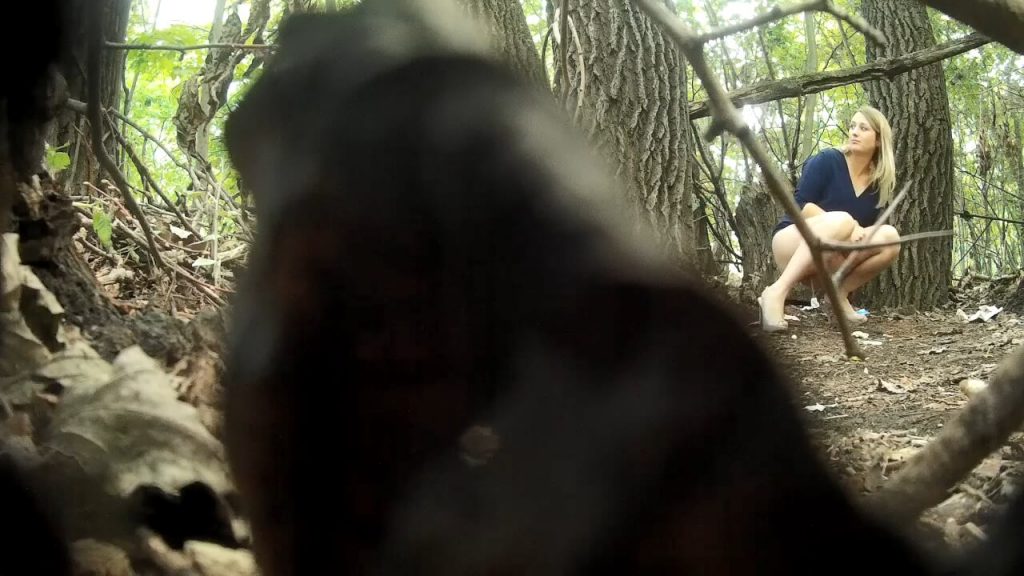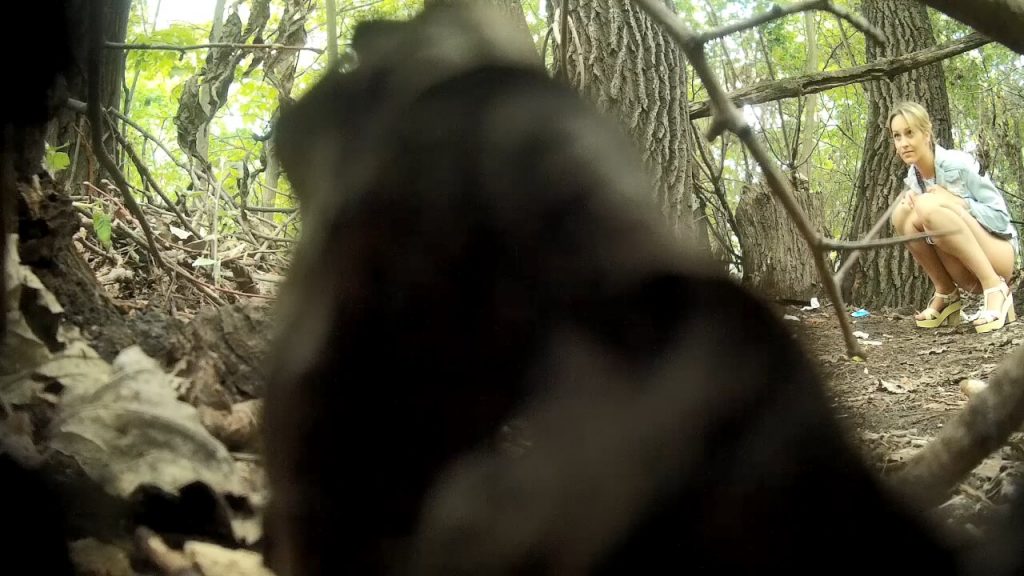 Girl squats low, panties yanked to ankles, her ass cheeks parted wide with a dripping pussy on full display. A hot piss stream shoots from her swollen slit, splashing dirt with filthy force. Her thighs tense, hole clenching as the golden flow gushes out in naughty relief.