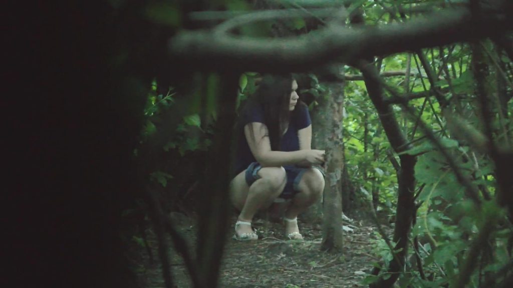 Girl is crouched in a state of primal, unshielded necessity, her denim pulled low to reveal the full, ivory expanse of her rear as it hovers over the earth. The soft, natural light accentuates the supple contours and firm swell of her flesh, which vibrates with the sudden, rhythmic liberation of her internal warmth. From the shadowed crevice between her spread thighs, a vigorous, steaming torrent erupts. Her posture is one of total, unthinking surrender to the wild, her muscles tensed as she fulfills this essential, solitary ritual in the humid silence of the woods.