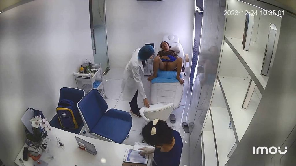 She lies exposed on the chair, legs splayed wide, her smooth Asian pussy lips parted as the doctor’s gloved fingers tease the slick folds with intimate precision. Her body quivers subtly, clit swelling in forbidden arousal, juices glistening under the spy cam’s sneaky gaze. The sheer, unadorned visibility of her most private core transforms the necessary posture into a charged, forbidden spectacle, a moment of profound, sensual unveiling.