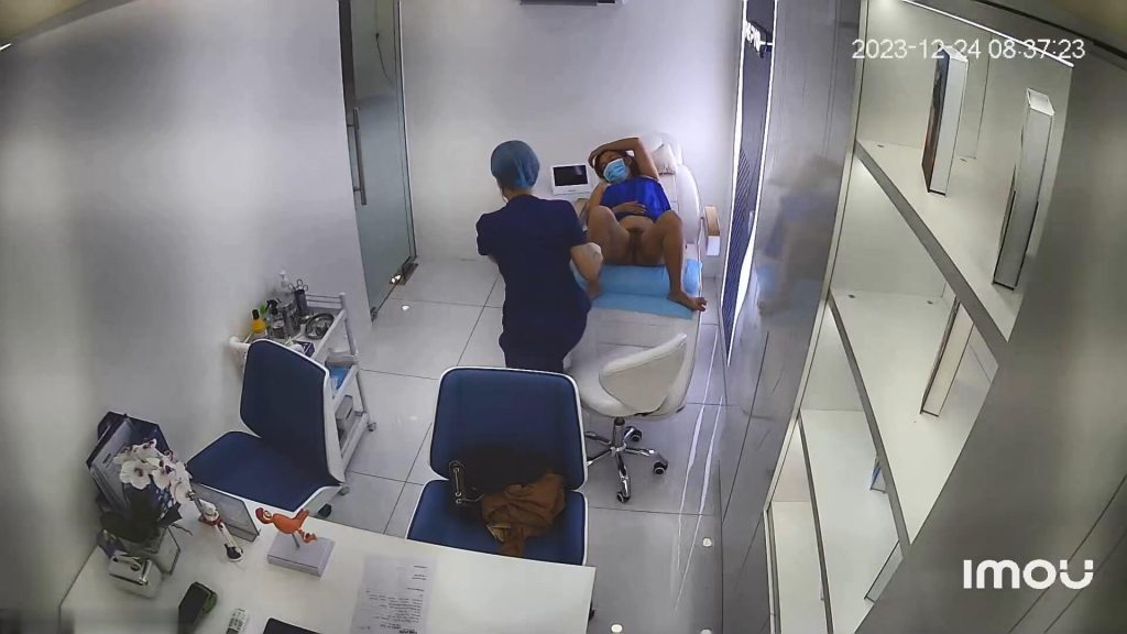 She lies exposed on the chair, legs splayed wide, her smooth Asian pussy lips parted as the doctor’s gloved fingers tease the slick folds with intimate precision. Her body quivers subtly, clit swelling in forbidden arousal, juices glistening under the spy cam’s sneaky gaze. The sheer, unadorned visibility of her most private core transforms the necessary posture into a charged, forbidden spectacle, a moment of profound, sensual unveiling.