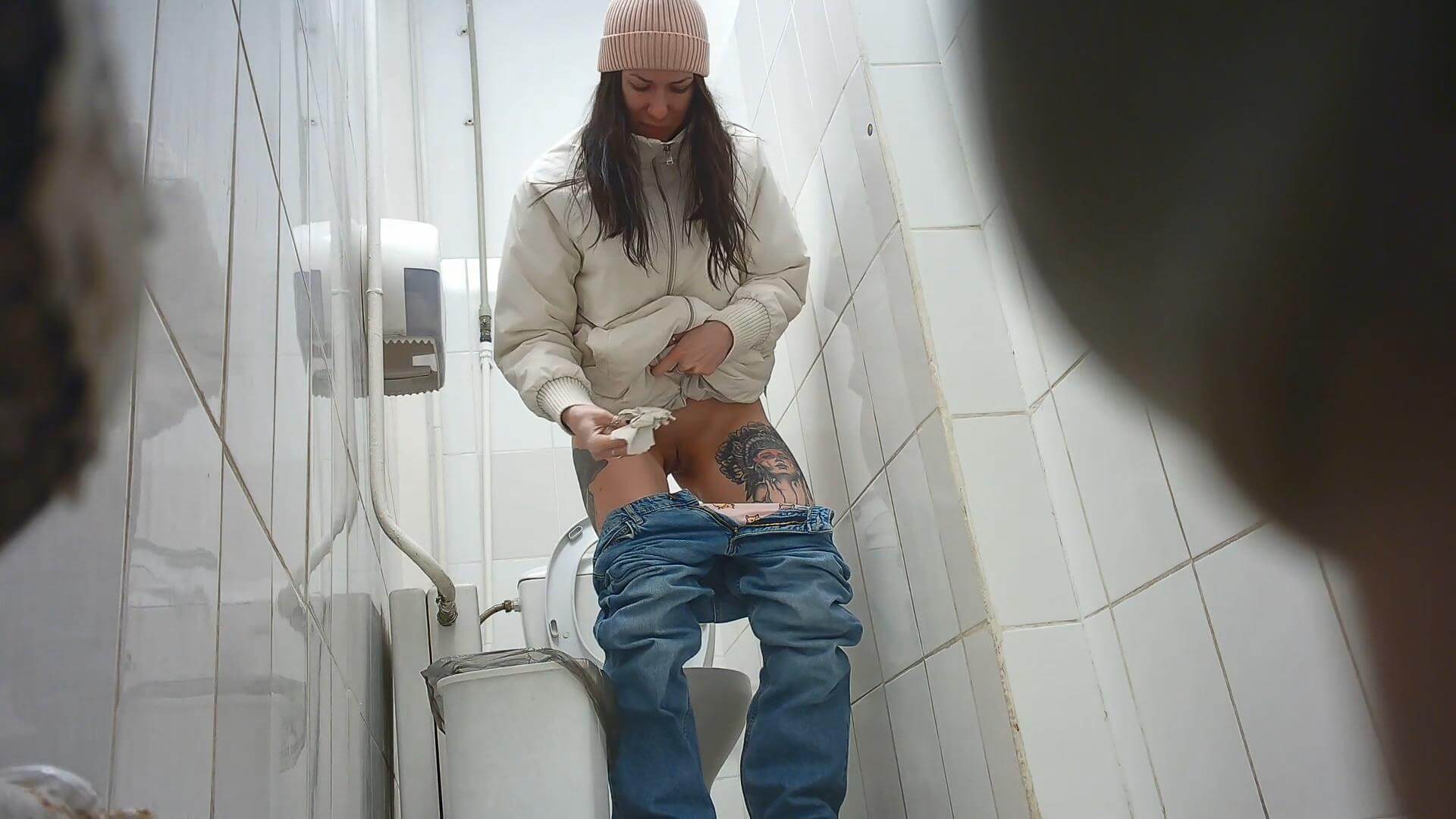 Girl squats low in her beige jacket and pink beanie, jeans yanked to knees, baring her shaved pussy with a tribal thigh tattoo as piss gushes out. Her swollen lips spread, stream arcing hard into the bowl like a desperate release. Thighs tense with the flow, hole winking in filthy rhythm. Body leans forward, craving secret touch amid the warm leak.