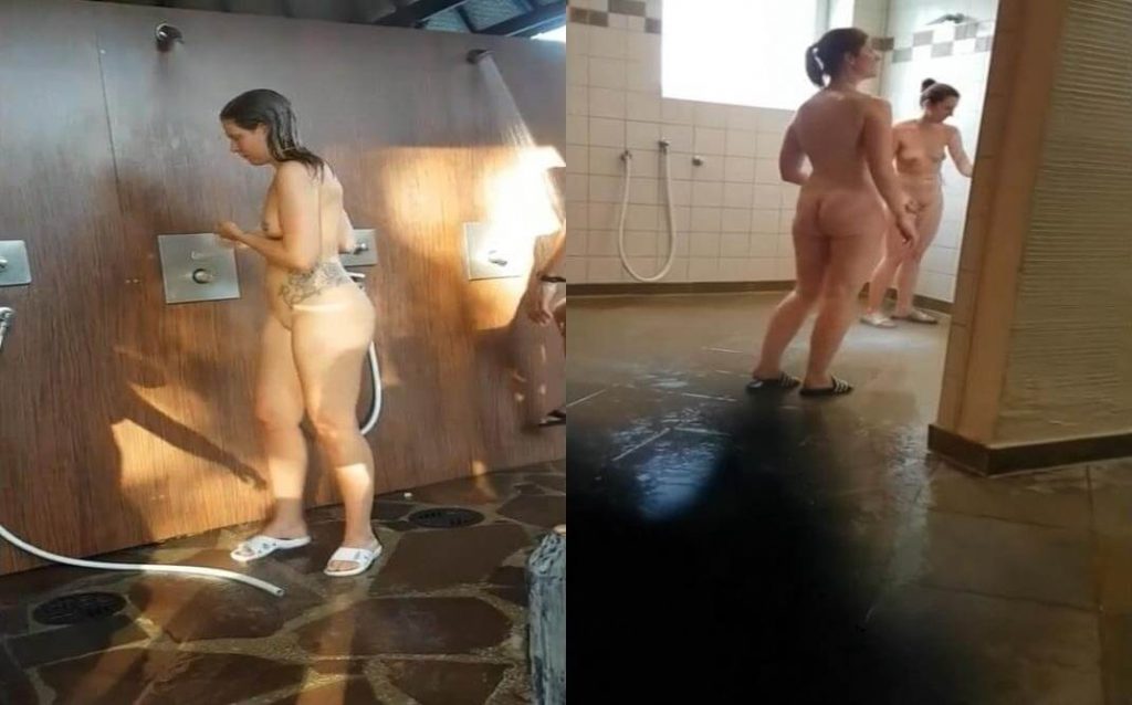 Nude young slut stands with arms crossed, perky tits bare and nipples stiff like needy peaks craving pinch. Her shaved cunt glistens smooth, lips plump for dirty spread, hips curving wide in teasing display. Older bitch walks away, sagging boobs hanging heavy, ass jiggling firm begging slap. Bodies flush hot, vulvas throbbing slick in raw spa exposure.